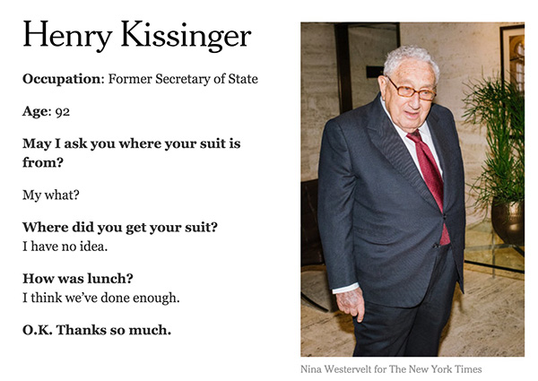 Potentially the best end to a New York Times Style section is Henry Kissinger: