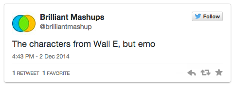 First off, I'm pretty proud of this, but I (with the help of Claire and Brendan) created a twitter bot that auto-generates mashups of pop culture properties.