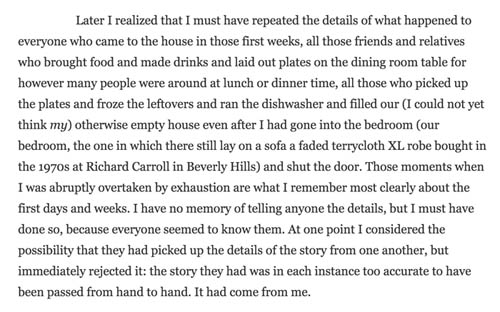 First off, I read Joan Didion's A Year of Magical Thinking in the weeks afterward which everyone said was a bit masochistic, but Didion has such a way with words, a way with grief, and a way to reassure that these thoughts are not crazy, that it was so incredible to me: