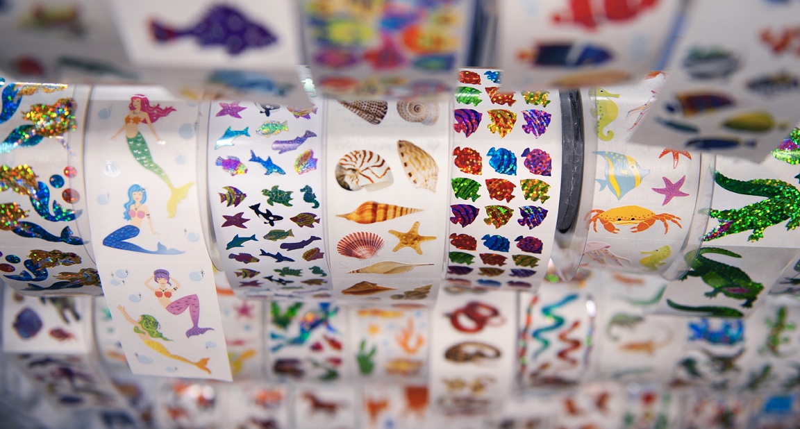 The store itself was walls of roll stickers (see below), and if you were a Kid Of A Certain Temperament, I feel like I don’t need to describe this, but all the rolls were laid out, and you would gently pull down however much of the sticker sheet you wanted, and then gently tear it along the perforations in the soft waxy paper.
