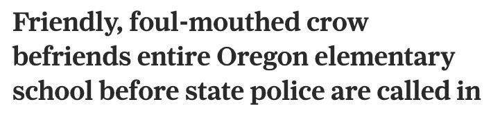 An all-timer of a headline, featuring Cosmo the crow outwitting wildlife troopers, and eventually "would sit on top of Planet Fitness, talking to people who were going in" looking for his (human) caretaker. They were eventually reunited after "about 45 minutes of...offering sardines."